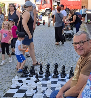 Zum Helmbrechtser Kinder-, Jugend- und Familientag am Gelände der Alten Weberei in Helmbrechts hatte der Schachklub Helmbrechts ein großes Open-Air-Schach aufgebaut, das von den Besuchern, ob jung oder alt, sehr gerne angenommen wurde, um eine kleine Partie des königlichen Spiels zu spielen.