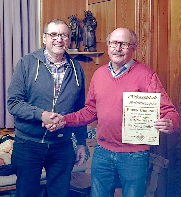 Bei dieser Gelegenheit wurde Wolfgang Löffler für seine 50jährige Mitgliedschaft beim Schachklub geehrt. Vorstand Stefan Heß sprach seinen Dank für die langjährige Treue zum Verein aus und überreichte neben einer Urkunde ein kleines Präsent.